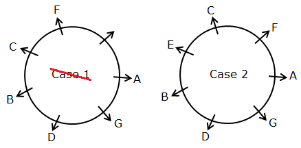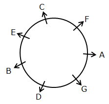 Seven persons viz. A, B, C, D, E, F and G are standing on a circular line such that all of them are facing away from the center, but not necessarily in the same order.