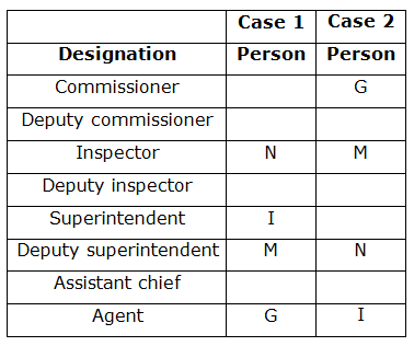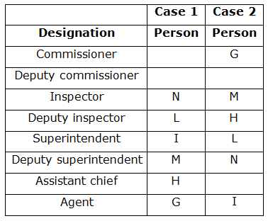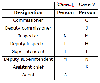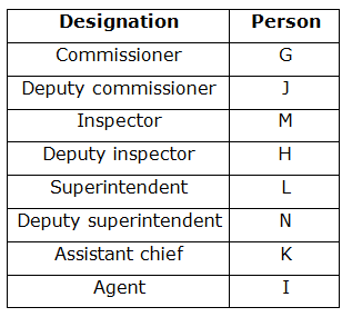 Eight persons viz. G, H, I, J, K, L, M and N are working in different designations in a police department, but not necessarily in the same order. Their designations are Commissioner, Deputy Commissioner (DC), Inspector, Deputy Inspector (DI), Superintendent, Deputy Superintendent (DS), Assistant chief (AC) and Agent. The order of seniority is same as given above i.e. Commissioner is the senior most and Agent is the junior most person.