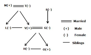 A family consists of eight members and two married couples. V is the father of H who is the only daughter of G. S is the mother of G who is sister-in-law of L. O is nephew of L. T has only one son. M is the father of V and spouse of T. G does not have siblings.