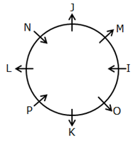 K sits second to the left of I and vice versa. Two persons sit between K and N, who is not adjacent to I. The immediate neighbors of both N and I faces the same direction i.e., if one person faces inside then the other faces inside and vice versa. N faces the center. P sits second to the right of N whereas O sits second to the right of P.Two persons sit between L and M where both face the same direction. J sits to the immediate left of M but not second to the right of K.