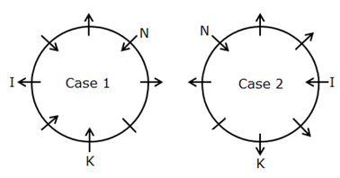 1) K sits second to the left of I and vice versa. Two persons sit between K and N, who is not adjacent to I. The immediate neighbors of both N and I faces the same direction i.e., if one person faces inside then the other faces inside and vice versa. N faces the center. Not more than two adjacent persons face the same direction.