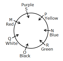 Seven persons viz. M, N, O, P, Q, R, and S are sitting on a circular table such that all of them are facing inside and each person wears a different colour dress viz. Black, Blue, Green, Purple, Red, White, and Yellow, but not necessarily in the same order.