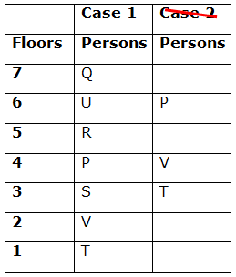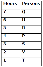 Seven people P, Q, R, S, T, U, and V are staying in different floors of the hotel such that the bottom-most floor is numbered as 1 and the floor just above the bottom-most floor is numbered as 2 and so on till the topmost floor is numbered as 7 but not necessarily in the same order. Only one person stays on each floor.