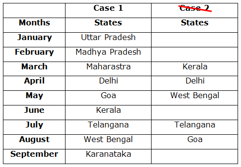Two states are celebrated between Goa and West Bengal, neither of them celebrates in the month having less than 31 days. The number of states celebrates after Kerala is one less than the number of states celebrate before Goa. Delhi celebrates three months before Telangana, neither of them celebrates at first nor at last. Madhya Pradesh celebrates immediately before Maharashtra. Karnataka and Madhya Pradesh are not celebrated in the month having more than 30 days.