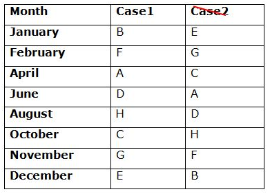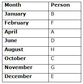 Eight persons- A, B, C, D, E, F, G, and H get the job in different months- January, February, April, June, August, October, November, and December in the same year (2020) but not necessarily in the same order.