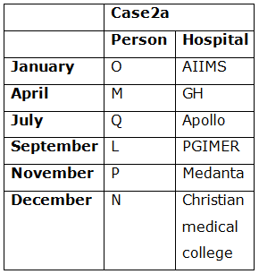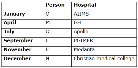 Six persons- L, M, N, O, P, and Q are taking the vaccination in different months- January, April, July, September, November, and December of the same year. They are taking the vaccination in different hospitals- AIIMS, Christian Medical College, Medanta, PGIMER, GH, and Apollo but not necessarily in the same order.