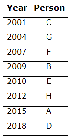 Eight persons- A, B, C, D, E, F, G, and H are completed their higher secondary eduaction in different years- 2001, 2004, 2007, 2009, 2010, 2012, 2015, and 2018 but not necessarily in the same order.