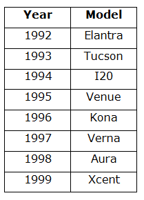 Eight different Hyundai car models viz. Aura, Elantra, I20, Kona, Tucson, Venue, Verna, and Xcent are launched in different years from 1992 to 1999, but not necessarily in the same order.