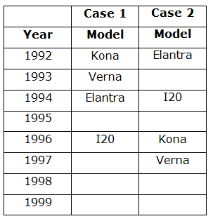 1) Kona was launched in a leap year and immediately before Verna. Only two cars were launched between Verna and I20, which was launched two years after Elantra