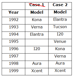 2) Xcent was launched in an odd-numbered year and immediately after Aura. Venue was launched neither before I20 nor after Verna. Hence, case 1 gets eliminated