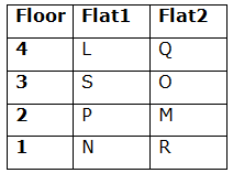 Eight persons- L, M, N, O, P, Q, R and S are living in the four-storey building with floors numbered 1 to 4 from bottom to the top. Each floor has two flats labelled as flat 1 and flat 2 from west to east respectively. No two people live in the same flat.
