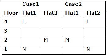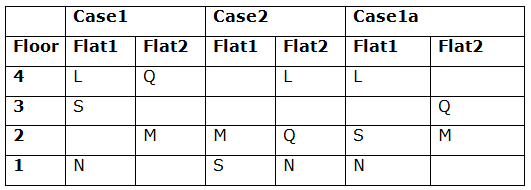 2) Both M and Q live on the topmost floor where Q lives to the east of M. One floor is between Q and N where both live in different flats.