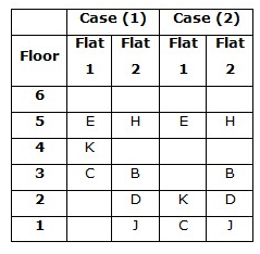 There are 12 people A, B, C, D, E, F, G, H, I, J, K and L who stay on 6 floors (numbered 1 to 6) of a building but not necessarily in the same order. There are two flats on each of the six floors. The flats are numbered as 1 and 2 on each of the floors and are from left to right. Flat no. 1 of the floor no. 2 is exactly above the flat no. 1 of the floor no. 1 and so on.