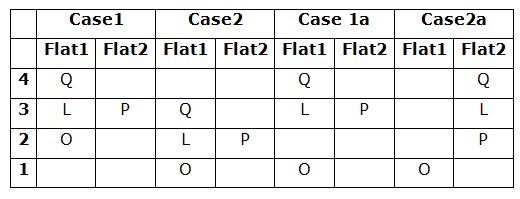 L lives two floors above M, both are living in different type of flats. M lives one of the floors above N. N and L lives on the same type of flat. Q lives immediate northeast flat of S. The number of floors above Q is the same as the number of floors below R. Both R and P live neither on the same floor nor in the same type of flat. O does not live below P.