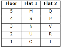 Ten persons viz. M, N, O, P, Q, R, S, T, U, and V are living in two different flats viz. Flat 1 and Flat 2 of a five story building, but not necessarily in the same order. Flat 1 is to the west of flat 2. The lowermost floor is numbered as 1 and the floor immediately above is numbered as 2 and so on.